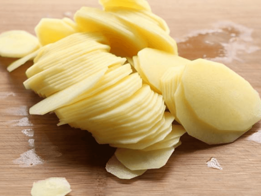 Đầu tiên, hãy gọt vỏ khoai tây và cắt chúng thành miếng mỏng.