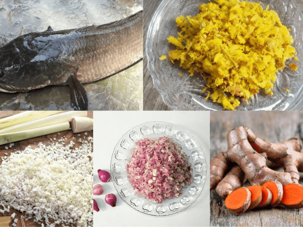 Sau khi thái cá thành miếng, bạn đặt chúng vào một tô lớn và thêm vào các gia vị như sau: 2 muỗng canh riềng băm, 2 muỗng canh gừng băm, hành tím băm, 2 muỗng canh mẻ chua, 2 muỗng canh mắm tôm, 1 muỗng cà phê bột nghệ và 1 muỗng cà phê hạt nêm.
