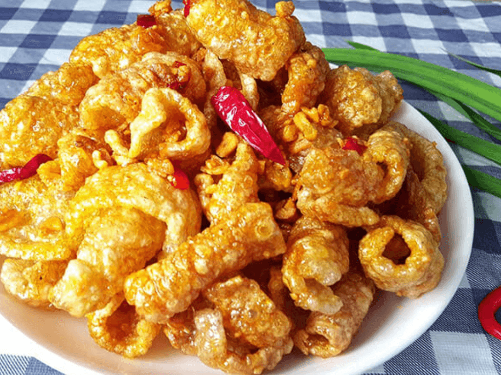 Chiên da heo ở nhiệt độ 180°C trong khoảng 15-20 phút.