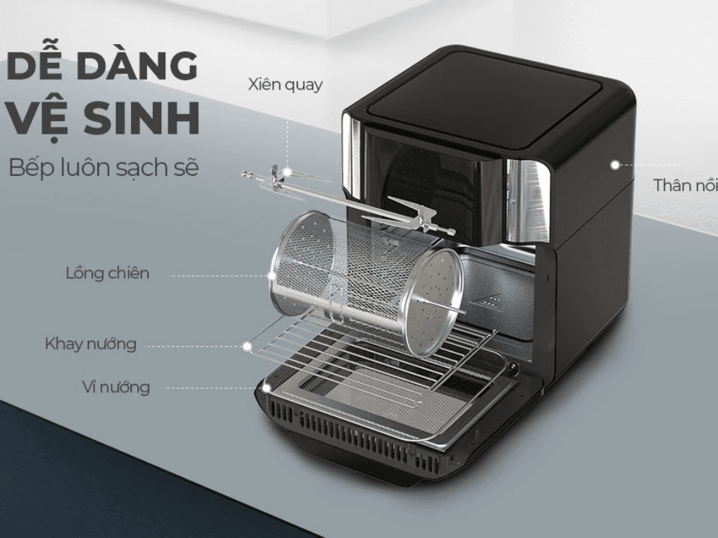 Một số nồi chiên không dầu hiện đại được trang bị lồng quay hoặc khay nướng quay tự động. Khi hoạt động, lồng quay hoặc khay nướng sẽ xoay đều, đảm bảo thực phẩm bên trong được nấu chín một cách đồng đều mà không cần người dùng phải lật thủ công. Điều này không chỉ tiết kiệm thời gian và công sức mà còn giúp thực phẩm giữ được hương vị và kết cấu tốt nhất, từ đó mang lại trải nghiệm nấu nướng tiện lợi và hiệu quả hơn.