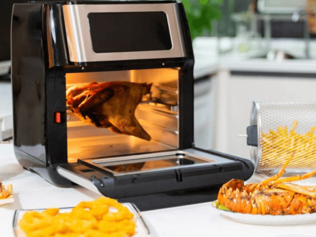 Phụ kiện đi kèm đa dạng như xiên quay, giỏ/lồng quay, nhông quay, dụng cụ lấy đồ, vỉ nướng chống dính và khay hứng đồ/dầu ăn, giúp bạn thực hiện các món ăn một cách linh hoạt.