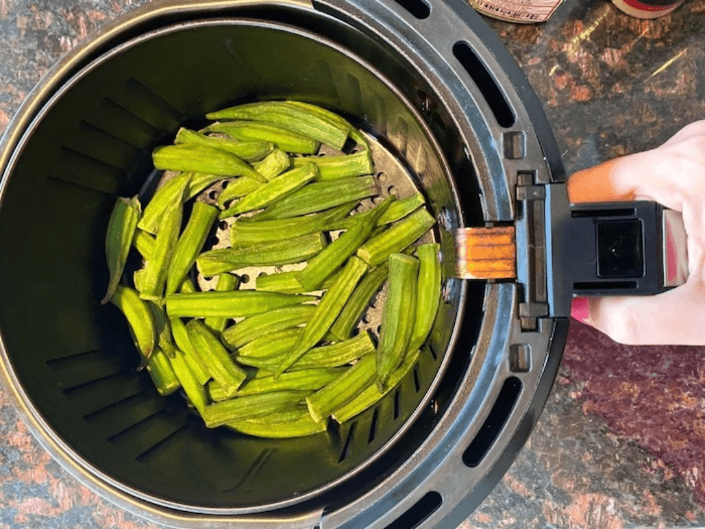 Xếp đậu bắp vào nồi chiên, cài đặt chế độ nướng khoảng 20 phút, đến khi đậu bắp chín vàng đều.
