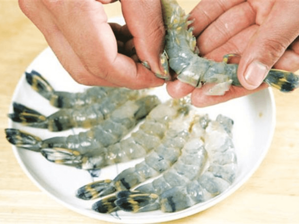 Sơ chế: Tôm sau khi mua về làm sạch, rút chỉ lưng và lột vỏ. Nhẹ nhàng gập đầu tôm, bóp để đẩy nhẹ các chất bẩn, sau đó kéo rút chỉ lưng, loại bỏ đầu và vỏ tôm. Có thể dùng dao hoặc kéo để thao tác thuận tiện.