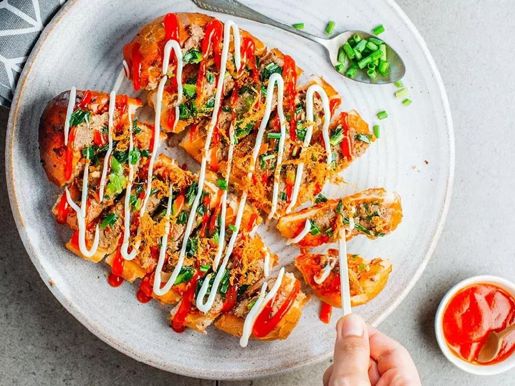 Trong khi đợi nồi cơm điện sharp nóng, bạn chuẩn bị sốt quét bánh mì. Bạn đun chảy bơ cho bơ vào bát nhỏ cho thêm 2 muỗng sa tế cùng tương ớt lượng vừa đủ. Cuối cùng, bạn quét hỗn hợp này lên bánh mì và cho bánh mì bỏ vào nồi cơm điện để nướng.