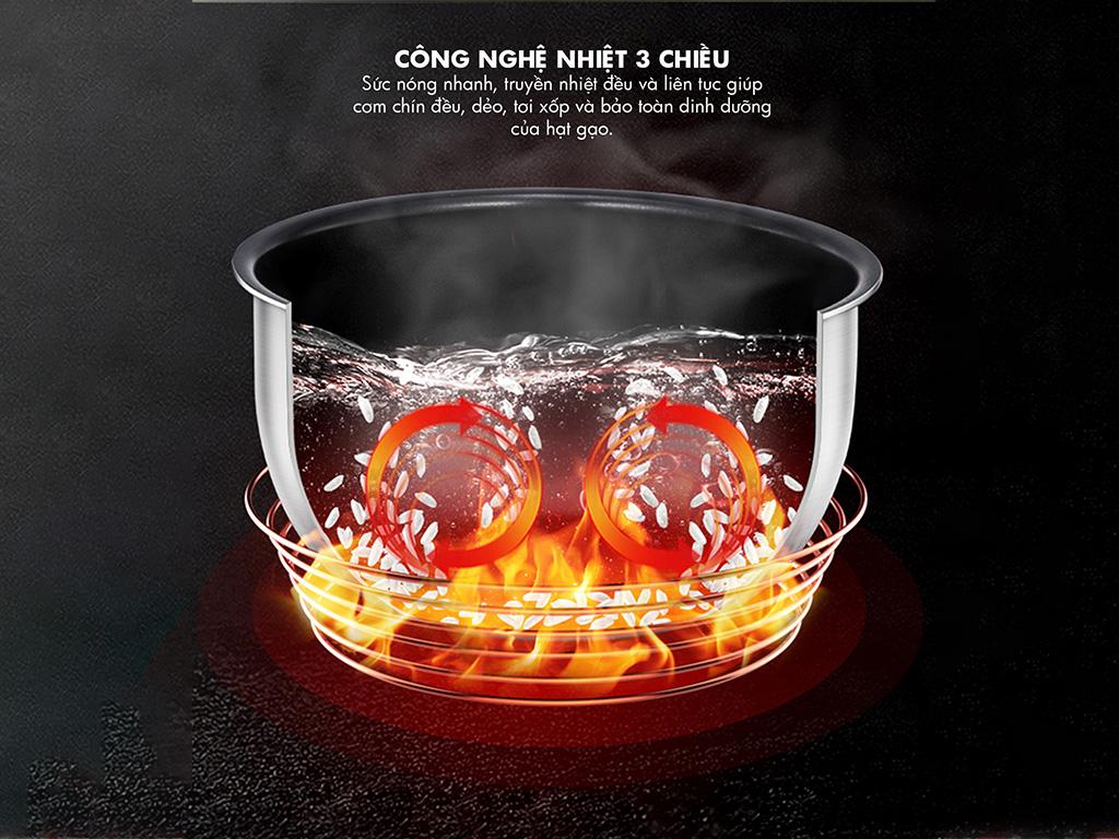 Nồi cơm điện tử Hokido sử dụng công nghệ nấu 3D hiện đại, tạo ra nhiệt độ cao và đồng đều từ 3 phía trên, dưới và xung quanh, giúp nấu cơm và các món khác nhanh chóng, chín đều, ngon và giữ được độ ẩm, dinh dưỡng và hương vị tốt nhất.