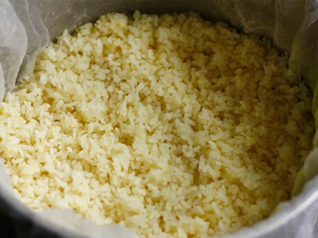 - Cho gạo nếp đã ráo nước vào nồi hấp, trải đều để gạo chín đều. Hấp trong khoảng 30-40 phút đến khi xôi chín dẻo.