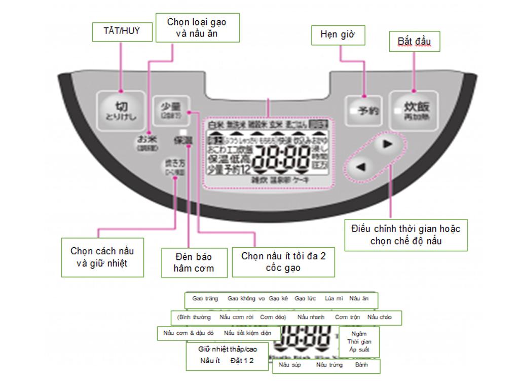Khác với các mặt hàng nhập khẩu có phiên dịch tiếng Anh, hầu hết sản phẩm nội địa Nhật chỉ có chú thích bằng tiếng Nhật, gây khó khăn trong việc tra cứu và sử dụng. Trước khi tìm hiểu cách sử dụng nồi cơm điện Hitachi Nhật Bản, bạn cần nắm rõ một số thuật ngữ trên bảng điều khiển, cụ thể: