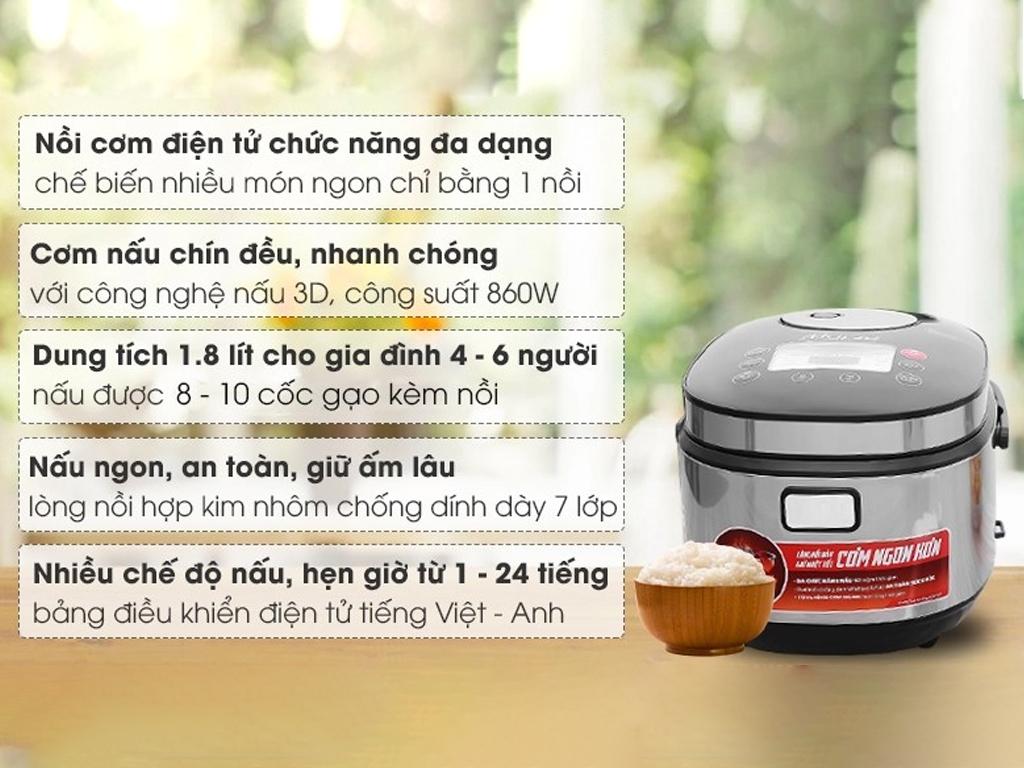 Công nghệ nấu 3D với công suất 860W cho phép cơm nấu chín đều, nhanh chóng và giữ nguyên dưỡng chất. Bảng điều khiển dễ sử dụng, có nhiều chế độ nấu tự động từ cơm trắng thông thường đến cháo, hấp và làm bánh, phục vụ nhu cầu ẩm thực đa dạng của gia đình.
