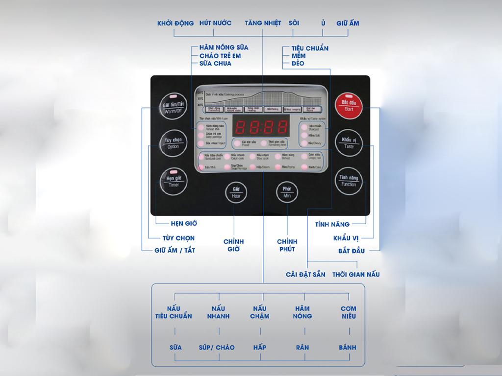 Sunhouse là thương hiệu đồ gia dụng nổi tiếng đến tử Việt Nam vì thế các ghi chú trên nồi rất dễ hiểu dưới đây là bảng điều khiển trên nồi bạn có thể tham khảo: