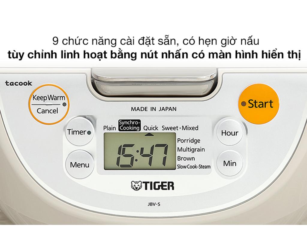 Chức năng hẹn giờ của nồi cơm Tiger JBV S18W cho phép bạn tự định nghĩa thời gian nấu cơm, giúp bạn linh hoạt trong việc lên lịch chuẩn bị bữa ăn.