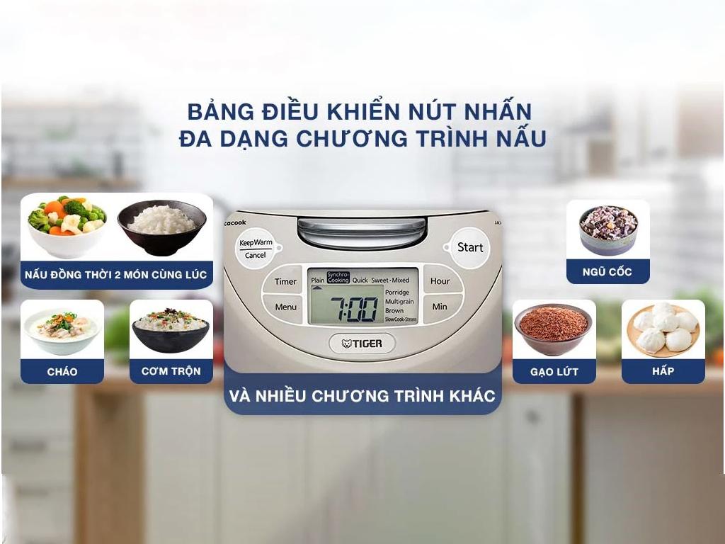 Ngoài chức năng nấu cơm thông thường, nồi cơm điện Nhật mới còn được trang bị nhiều chức năng nấu khác nhau: nấu cháo bằng nồi cơm điện, nấu xôi bằng nồi cơm điện, hầm xương, làm bánh,... nồi cơm Tiger JBV S18W mang lại sự linh hoạt và đa dạng trong việc nấu ăn. Bạn có thể dễ dàng chế biến nhiều loại món ăn khác nhau chỉ với một chiếc nồi.