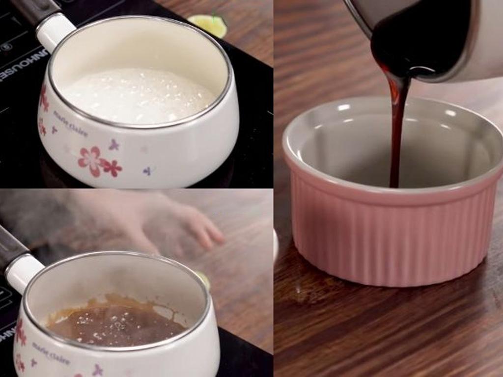 - Sau khi đường đã tan hết và chuyển màu nâu cánh gián đẹp mắt bạn cho thêm 25g nước và đảo đều. Tiếp đó, bạn tranh thủ khi caramel còn nóng bạn nhanh tay đổ ngay vào khuôn. Nếu để lâu caramel sẽ nguội và bị sệt lại khó đổ hơn rất nhiều.
