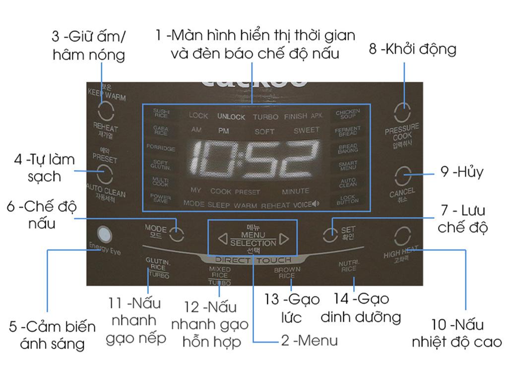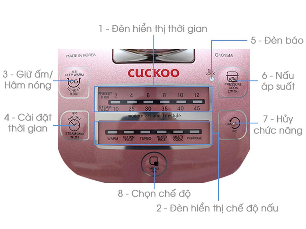 Hướng dẫn chức năng nút bấm - cách sử dụng nồi cơm điện cao tần, nồi cơm điện tử, nồi cơm điện cao tần áp suất, nồi cơm điện Cuckoo nội địa Hàn Quốc.