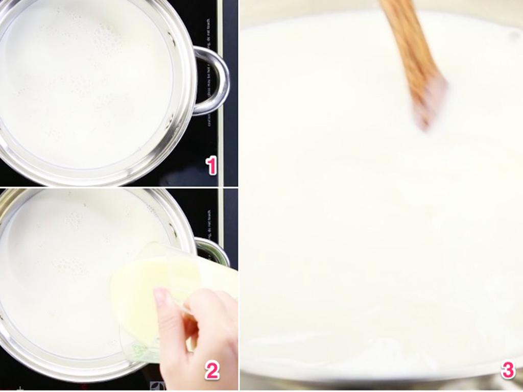 Bước 2: Cho sữa chua có đường và sữa đặc vào một bát nhỏ, khuấy đều cho tan. Sau đó, cho hỗn hợp này vào nồi sữa tươi, khuấy đều.