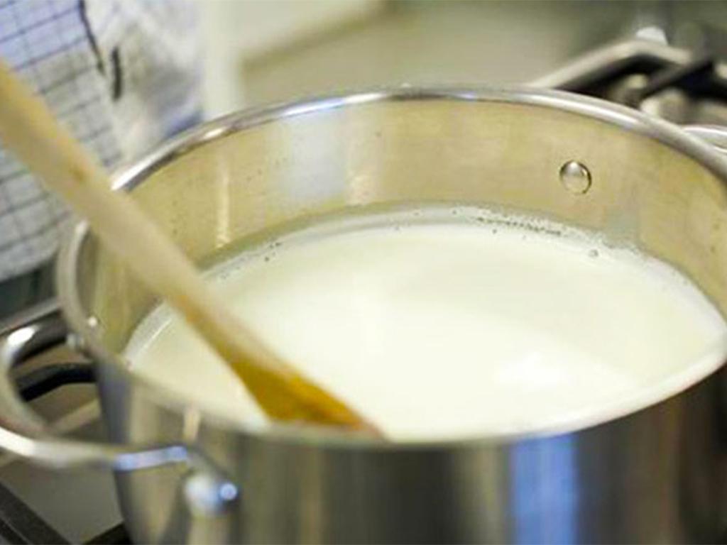 Bước 1: Cho sữa tươi vào nồi, đun sôi rồi để nguội cho đến khi nhiệt độ còn khoảng 40-45 độ C. Bạn có thể dùng nhiệt kế hoặc thử bằng tay để kiểm tra nhiệt độ sữa.