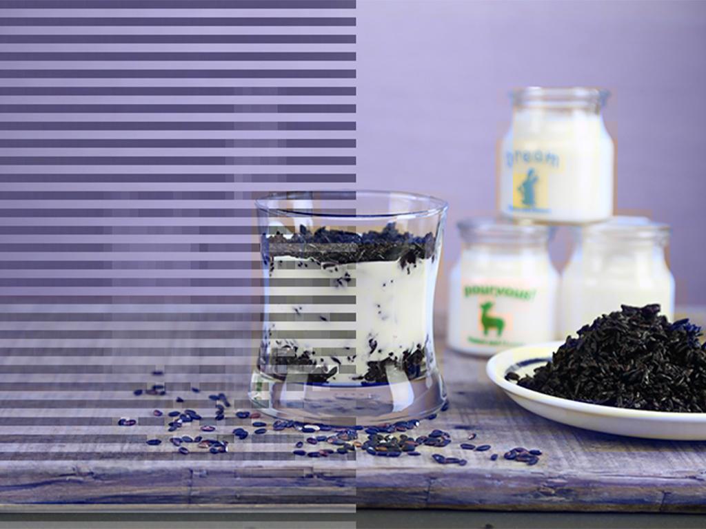 Sữa chua nếp cẩm có màu tím đẹp mắt và hương vị thơm ngon, được làm từ sữa tươi không đường, sữa chua có đường, sữa đặc và nếp cẩm. Món ăn này có vịt dai dòn của nếp cẩm hòa quyện cùng vị sữa chua béo ngậy tạo thành một bản thể không thể tách rời.