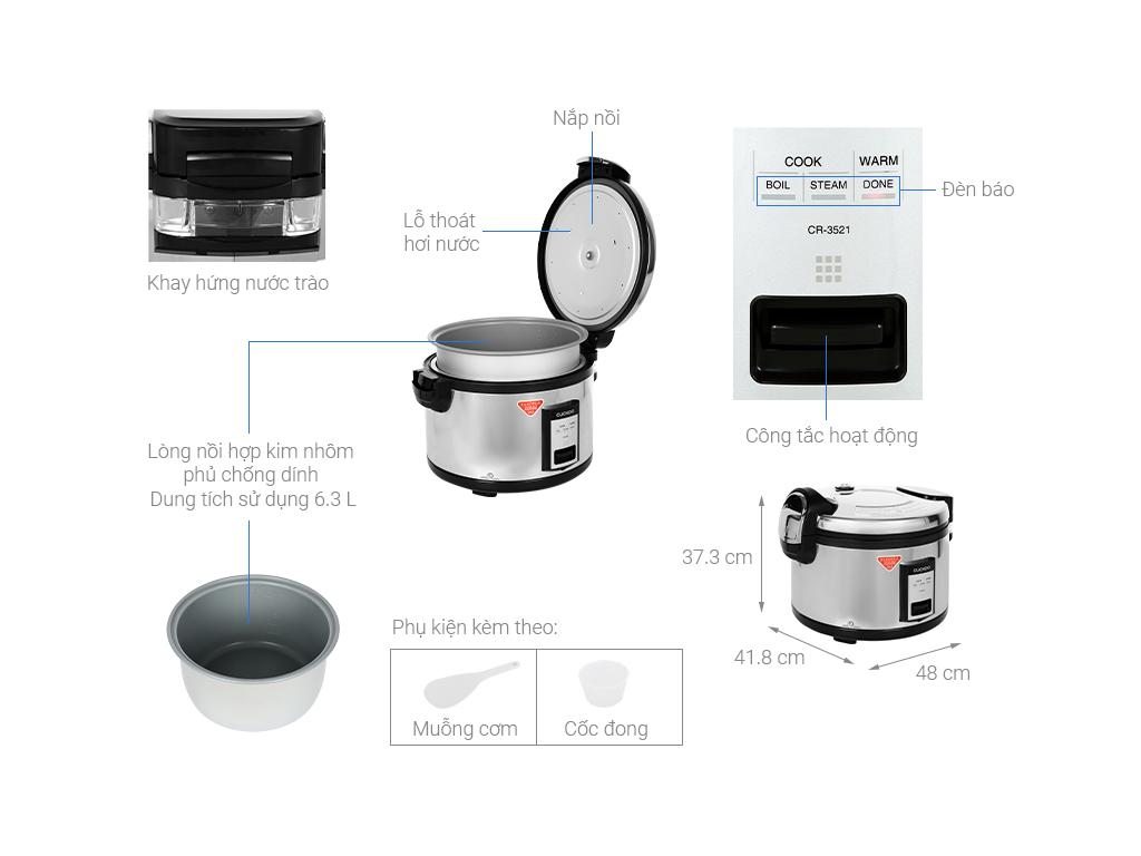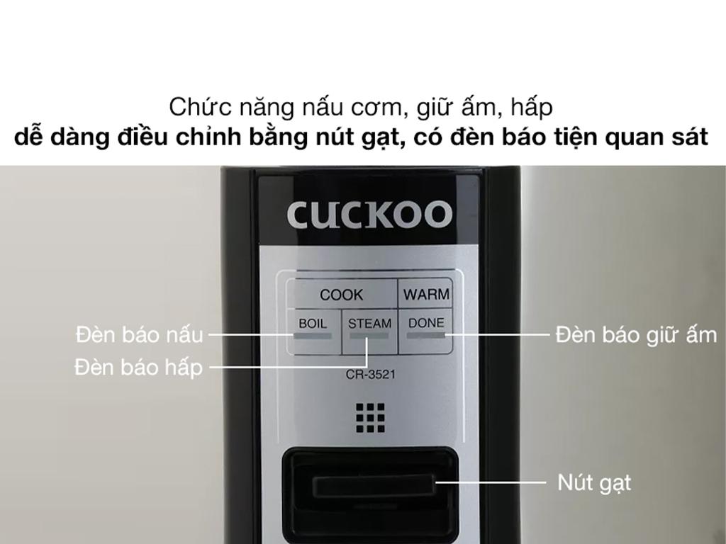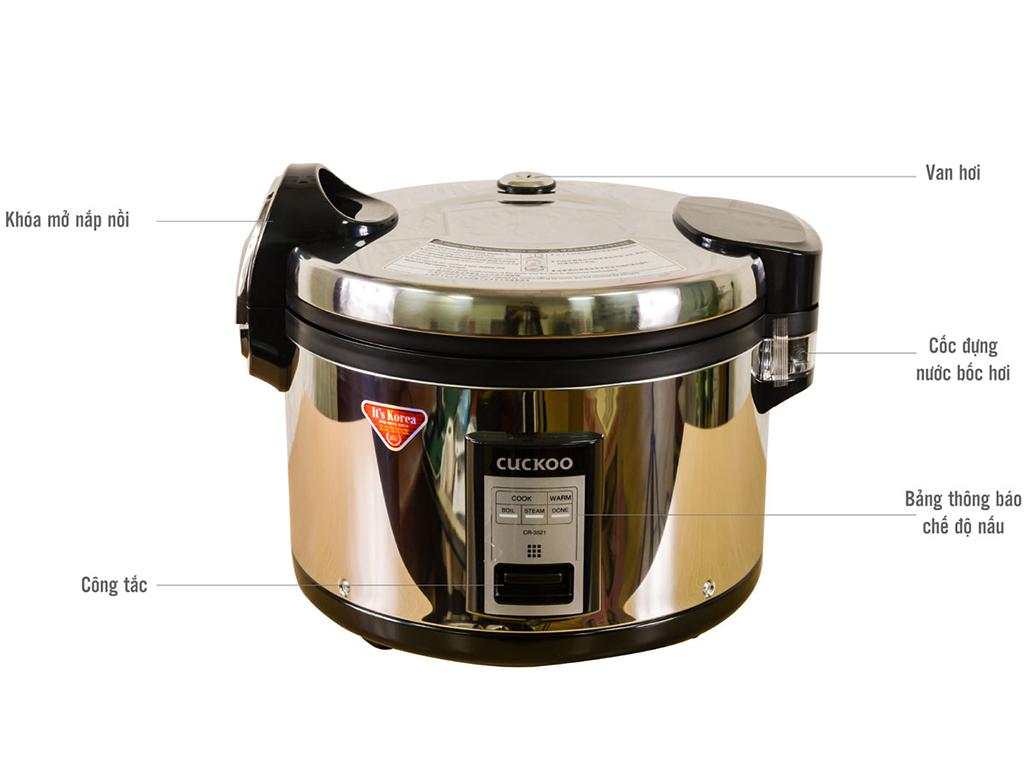 Nồi cơm điện công nghiệp Cuckoo CR-3521/BKSTVNCV là sản phẩm cao cấp nhập khẩu nguyên chiếc từ Hàn Quốc. CR-3521 được sản xuất bởi Cuckoo Electronics, một công ty chuyên về các thiết bị gia dụng và bếp.