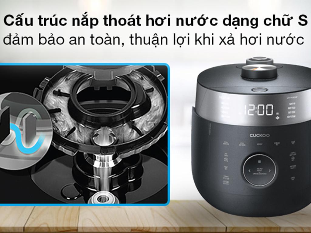 Nắp thoát hơi thông minh hình chữ S là điểm thiết kế đặc biệt trên nồi cơm điện Cuckoo 1l CRP-LHTR0609F. Nếu như trên nồi cơm thông thường như nồi cơm điện philips, nắp hơi được làm từ nhựa hoặc kim loại có một khe thoát hơi để giáp áp suất trong nồi khi sử dụng. Tuy nhiên, thiết kế này có nhược điểm là không giữ được hơi nước và nhiệt độ một cách hiệu quả.