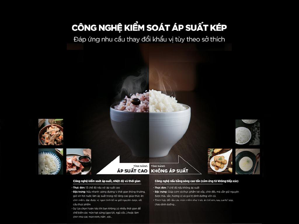Chức năng nấu áp suất kép được trang bị trên nồi cơm điện cao tần Cuckoo cho phép nấu cơm với áp suất cao hoặc không áp suất. Chế độ nấu áp suất cao giúp cơm chín nhanh và ngon hơn, chế độ nấu không áp suất giúp nấu các món ăn khác như hầm, nấu ngũ cốc, nấu đa năng. Chức năng này cũng được trang bị trên nồi cơm điện toshiba.