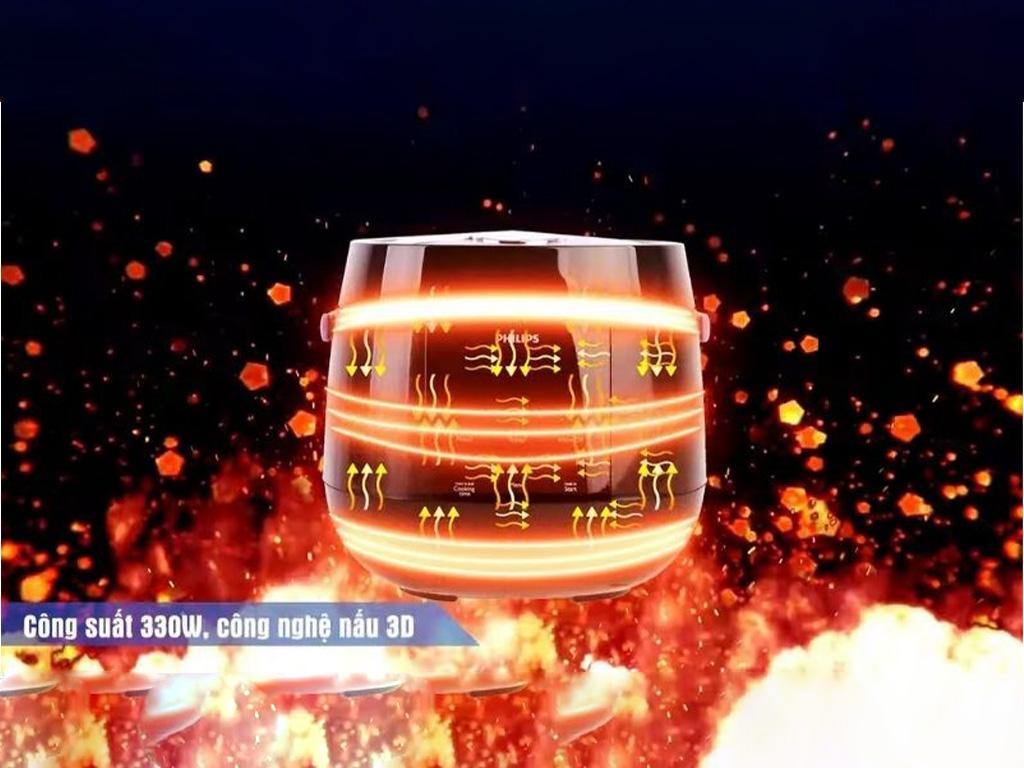 Công suất nồi cơm điện philips HD3060 này là 330W, không quá cao so với các nồi cơm điện khác vì vậy HD3060 giúp giảm chi phí tiền điện hiệu quả. So với các nồi cơm điện rẻ sử dụng công nghệ 2D, hay nồi cơm điện nắp rời sử dụng công nghệ 1D thì công nghệ 3D trên HD3060 được đánh giá là vượt trội hơn hẳn khi cho ra những hạt cơm chín đều, dẻo và thơm ngon.