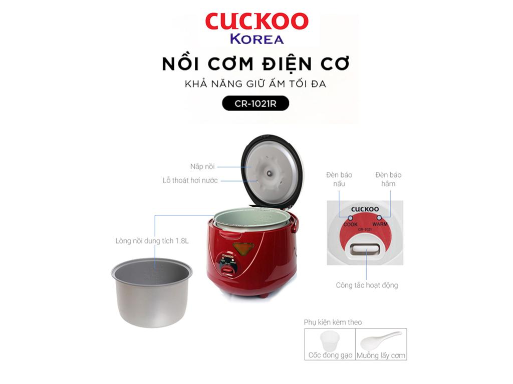 Ngoài nấu cơm, nồi cơm điện Cuckoo 1.8 lít CR 1021 cũng có thể nấu được nhiều món ăn đa dạng, tiện ích khác, như nấu cháo, làm bánh, nấu xôi bằng nồi cơm điện… nồi cơm điện cuckoo CR-1021 và CR 1055 có thể nấu được các món ăn trên, nhưng chỉ có một nút gạt để điều khiển chế độ nấu và hâm nóng, không có màn hình hiển thị hay các chức năng nấu tự động. Khả năng nấu này tương tự như trên mẫu nồi cơm điện xiaomi.