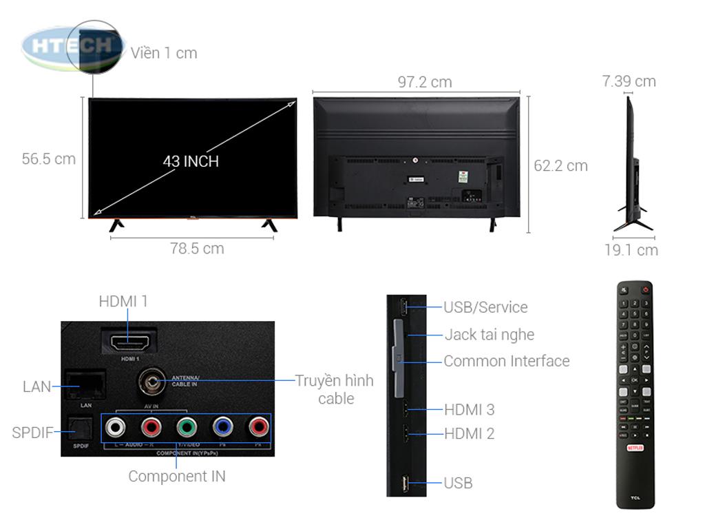 tivi tcl 43 inch l43s6500 có kích thước tổng thể bao gồm cả chân đế là 97.2 cm (ngang) x 62.2 cm (cao) x 7.39 cm (dày). Nếu bỏ chân tivi, chiều cao giảm xuống còn khoảng 56.5 cm, giúp linh hoạt hơn khi lắp đặt trên tường.