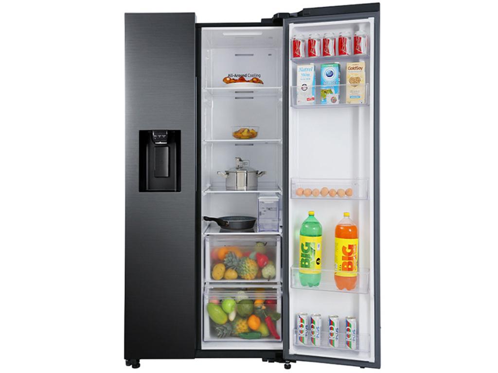 Thiết kế hiện đại, sang trọng: Tủ lạnh Samsung Side-by-Side có thiết kế hiện đại, sang trọng với tông màu chủ đạo là xám hoặc đen, phù hợp với mọi không gian bếp.