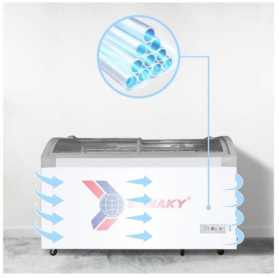 Sản phẩm được ứng dụng công nghệ làm lạnh 360 độ, hơi lạnh sẽ được tỏa đều bên trong tủ, tác động toàn diện lên bề mặt thực phẩm, đem đến hiệu quả làm lạnh sâu, đóng đông triệt để.
