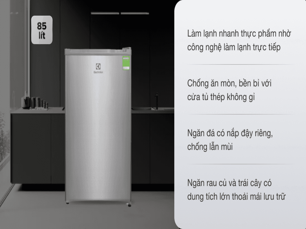 Electrolux EUM0900SA có dung tích 85 lít, là một lựa chọn xuất sắc cho không gian nhỏ và nhu cầu bảo quản thực phẩm cơ bản. Với thiết kế sang trọng và hiện đại, tủ lạnh này không chỉ tiết kiệm điện mà còn hoạt động rất êm ái. Electrolux nổi tiếng với chất lượng bền bỉ và hiệu suất ổn định, giúp bạn yên tâm về khả năng làm lạnh và bảo quản thực phẩm. Đây là sự lựa chọn tốt cho những người tìm kiếm một tủ lạnh mini đáng tin cậy với mức giá phải chăng.