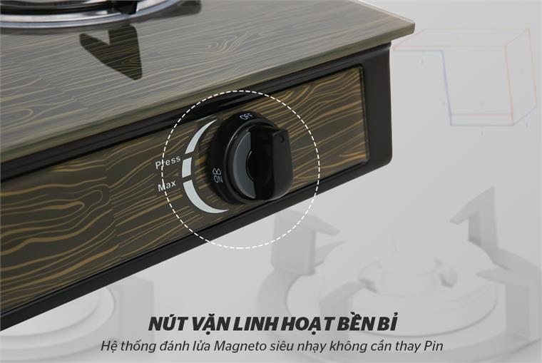 Sản phẩm có thiết kế nút bật tắt linh hoạt giúp bạn dễ dàng bật tắt và điều chỉnh lửa bằng 2 núm vặn cực nhạy, chỉ cần xoay 1 lần là lửa đã cháy, không cần bật nhiều lần gây rò rỉ và hao phí gas.