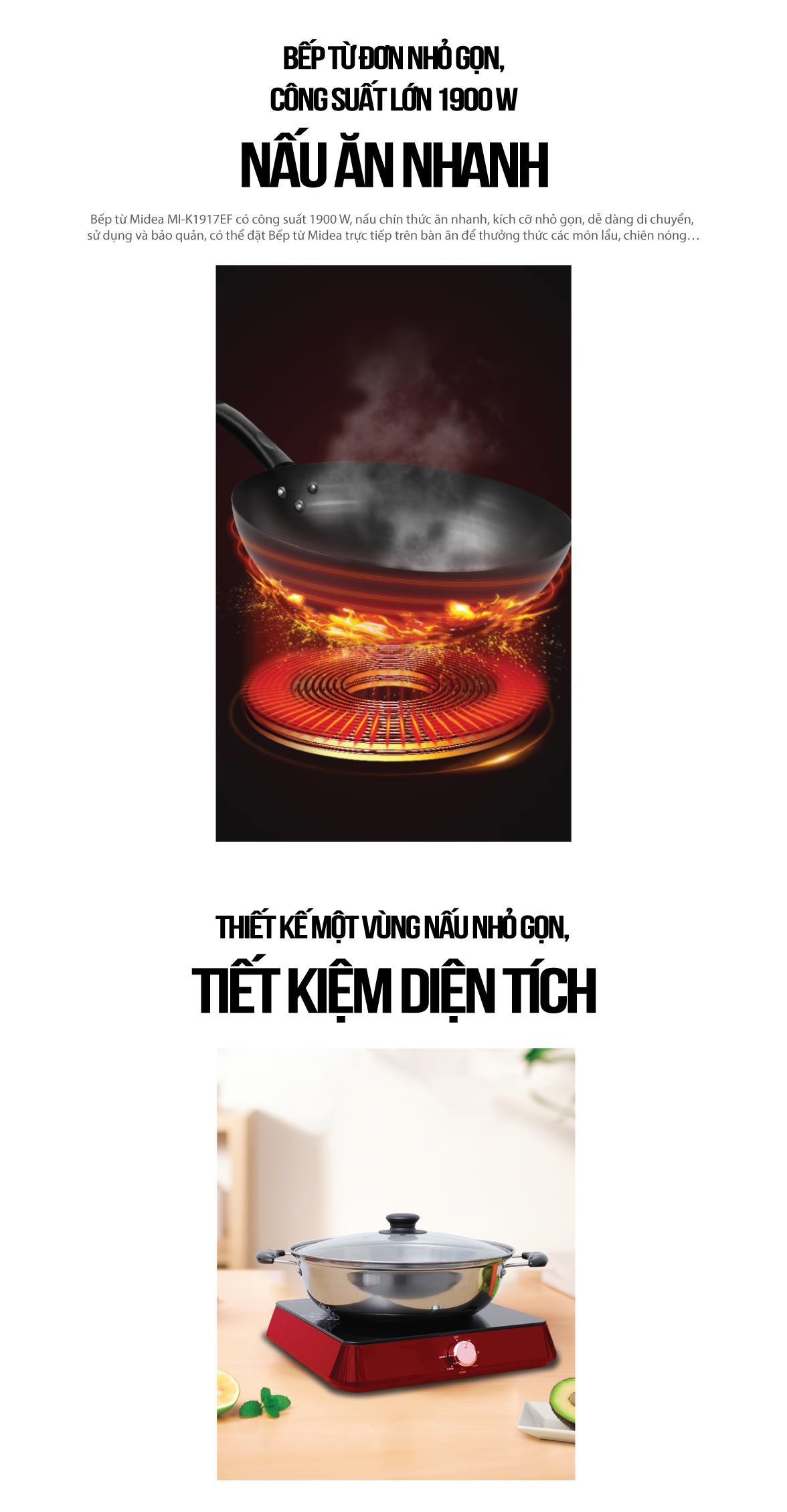 Bếp từ Midea MI-K1917EF có công suất 1900 W, nấu chín thức ăn nhanh, kích cỡ nhỏ gọn, dễ dàng di chuyển, sử dụng và bảo quản, có thể đặt Bếp từ Midea trực tiếp trên bàn ăn để thưởng thức các món lẩu, chiên nóng…