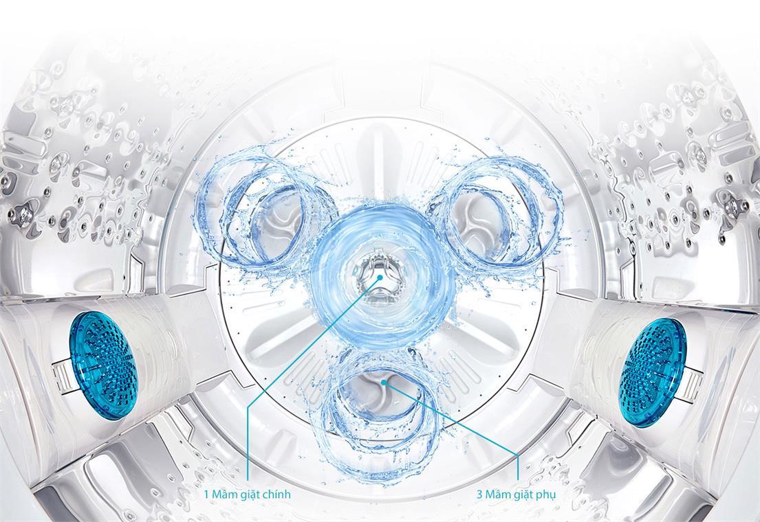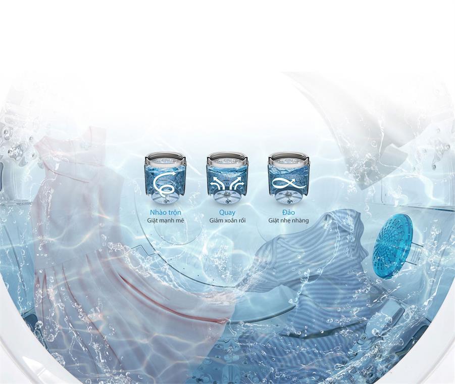 Punch+3 tạo ra các dòng nước theo phương thẳng đứng, đưa đồ giặt lên và xuống liên tục, mang tới hiệu quả giặt đồng đều.