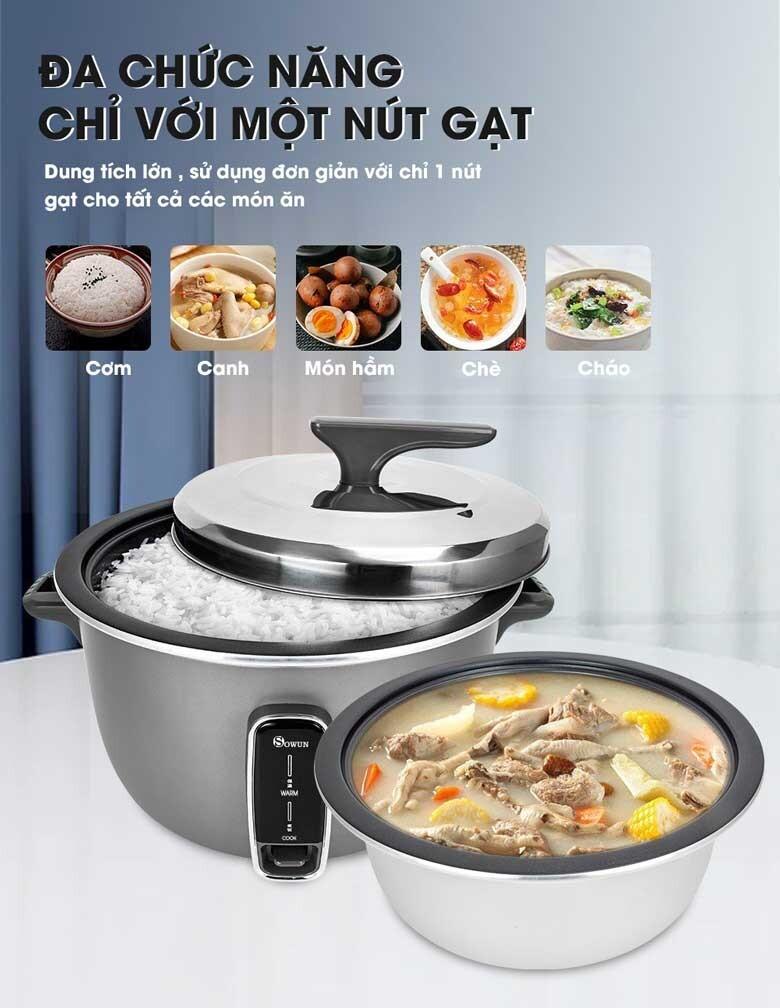 Ngoài nấu cơm, nồi cơm điện Sowun có thể nấu các món ăn khác như món canh, món hầm, nấu chề, cháo. Bạn chỉ cần chuẩn bị nguyên liệu, bỏ và nồi và gạt nút là xong.