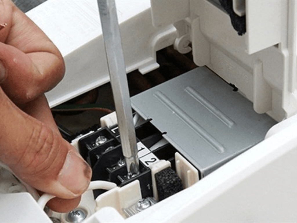 Tiến hành nối các đầu dây của dàn lạnh vào các đầu nối đã được đánh dấu (L, N, 1, 2). Đảm bảo rằng các đầu nối này được đấu nối chắc chắn và không bị lỏng. Dây nguồn sẽ được nối từ aptomat hoặc cầu dao đến các đầu nối của dàn lạnh.