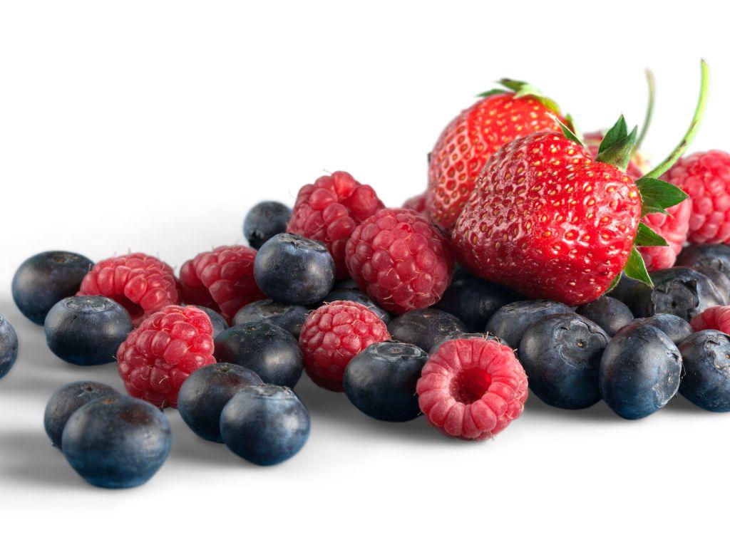 Sinh tố berry: Dâu tây, việt quất, mâm xôi, sữa chua, mật ong, đá.