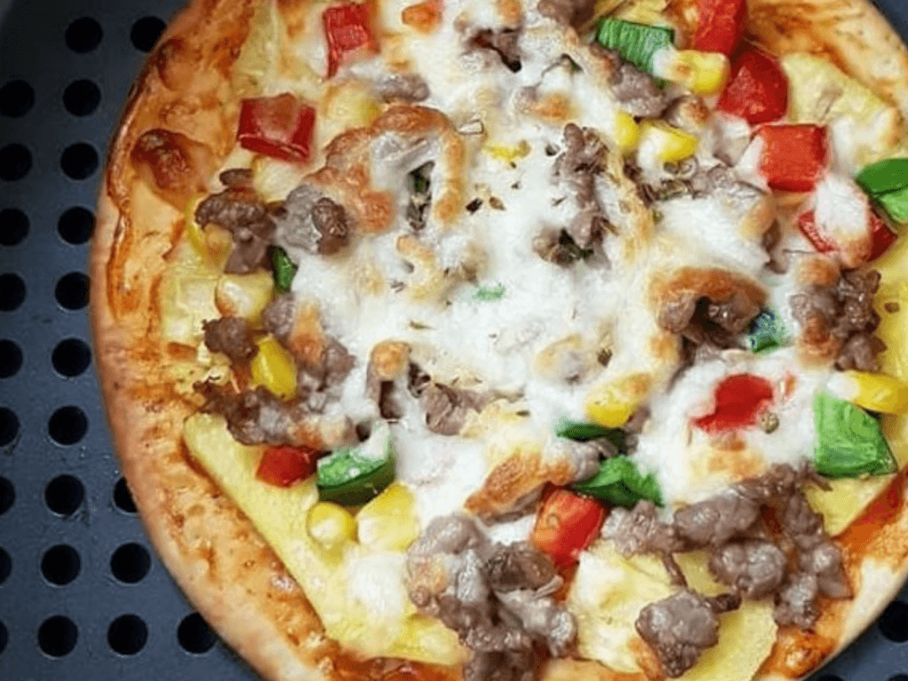 Sau 10 phút, bạn sẽ có một chiếc bánh pizza vị ngô ngọt phô mai thơm phức và hấp dẫn từ nồi chiên không dầu.