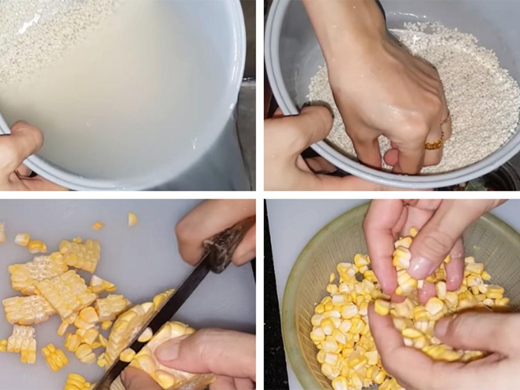 - Vo sạch gạo nếp và ngâm gạo nếp trong khoảng 2 giờ đồng hồ. Sau khi ngâm thì đổ ra rá cho ráo nước. Bắp lột vỏ rửa sạch để ráo nước. Sau đó, tẽ rời hạt ngô.