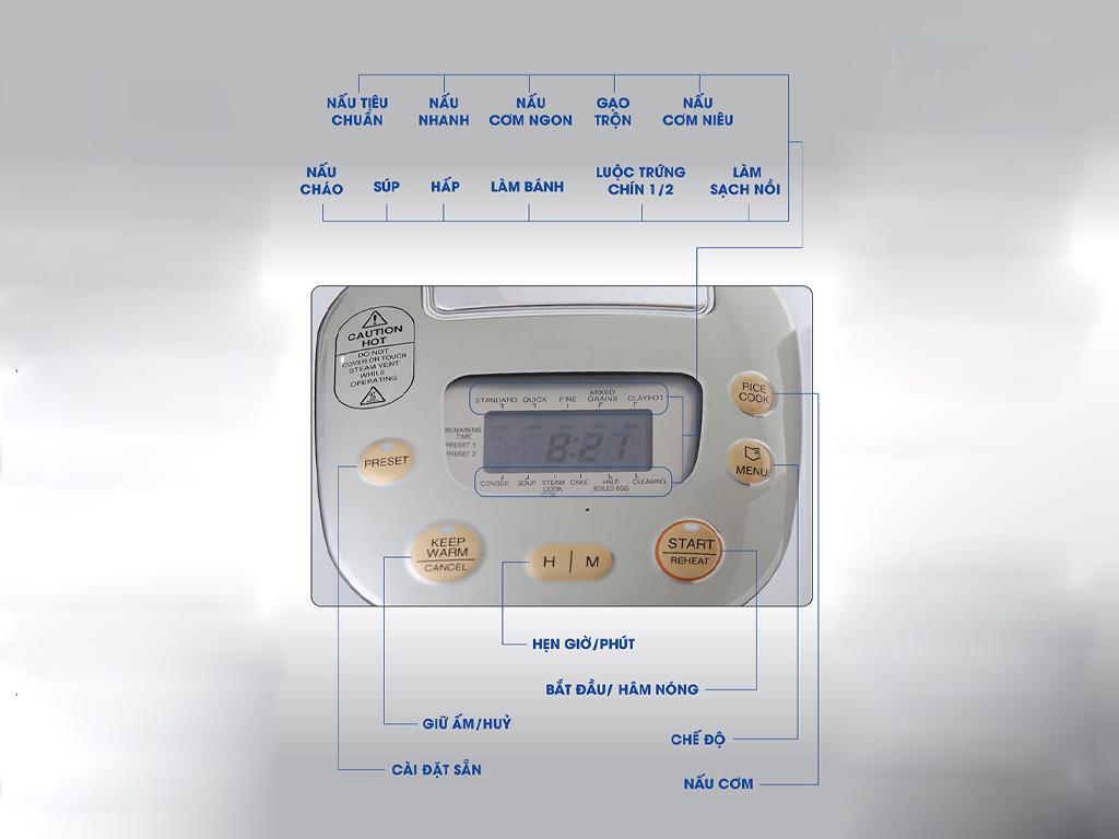- - Nút cài đặt sẵn (Preset): Dùng để thiết lập các cài đặt nấu cơm trước, cho phép bạn có thể chuẩn bị sẵn và lên lịch nấu cơm trước đó.