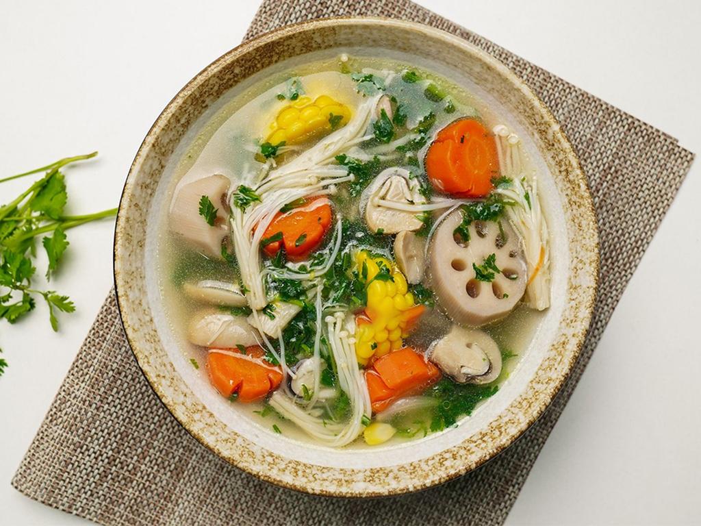 Củ sen già gọt sạch vỏ, cắt khoanh tròn với độ dày 1cm ngâm với nước muối chanh loãng sau đó vớt ra để ráo nước. Đối với ngô ngọt, cà rốt, nấm cắt nhỏ, vừa ăn.