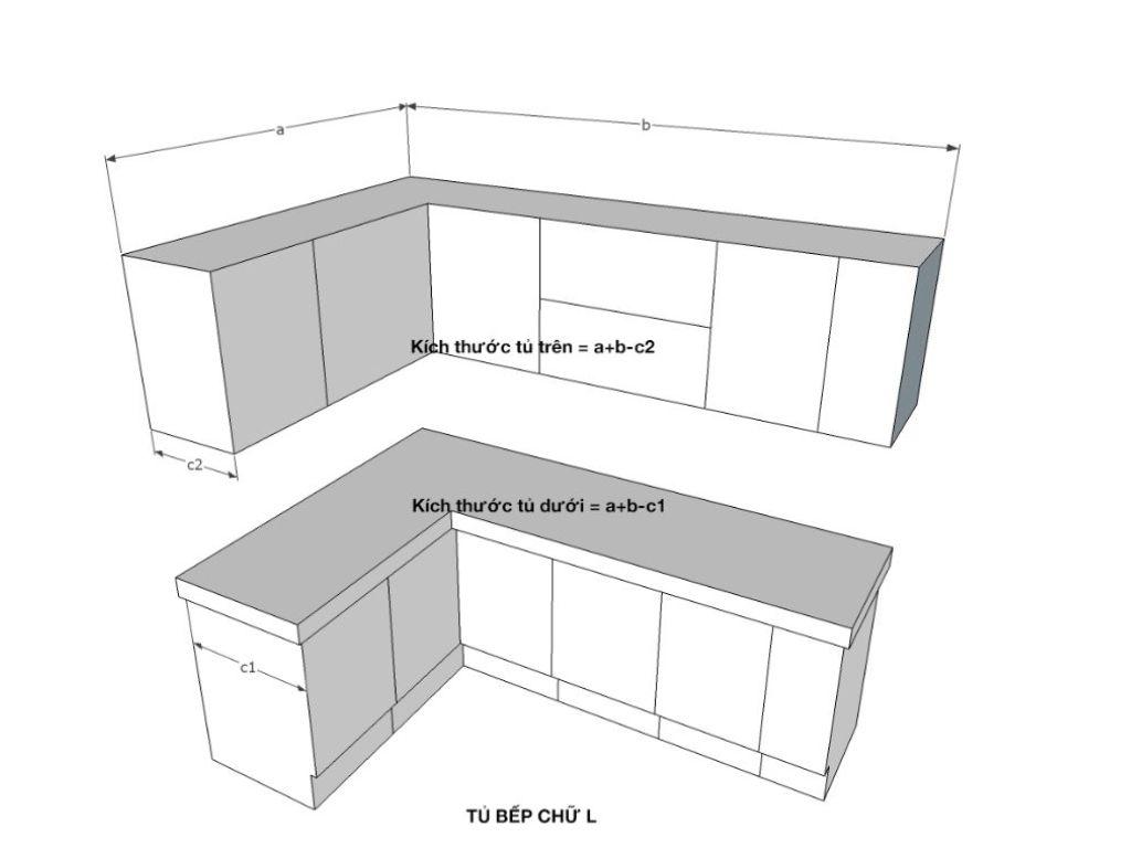 Kích thước của mẫu tủ bếp gỗ chữ L hay tủ bếp tân cổ điển chữ L được tính bằng cách lấy tổng chiều dài hai cạnh của tủ và sau đó trừ đi chiều sâu của tủ. Việc này được thực hiện do có phần giao nhau tại góc tủ. Tương tự như mẫu tủ bếp chữ I, mẫu tủ bếp chữ L cũng yêu cầu tính riêng kích thước của bếp trên và bếp dưới để có kích thước tiêu chuẩn tủ bếp.