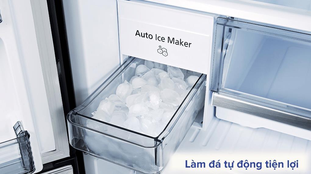 Ngoài ra, tủ lạnh còn được trang bị tính năng làm đá tự động, chỉ cần đổ nước vào phần bình chứa, tủ sẽ tự làm đá và tạo ra các viên đá nhỏ phục vụ cho người dùng mà không mất công đổ vô khay rồi xả nước vô khay lấy đá.